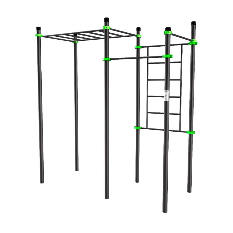 Тренажер объединяет три основные зоны тренировки: турники разной высоты, шведскую стенку и классический горизонтальный рукоход. Такое сочетание делает комплекс универсальной платформой для функциональных тренировок, развития силы хвата, мышц спины, плеч и пресса. Подходит как для самостоятельных занятий, так и для групповых тренировок на уличных спортивных площадках.