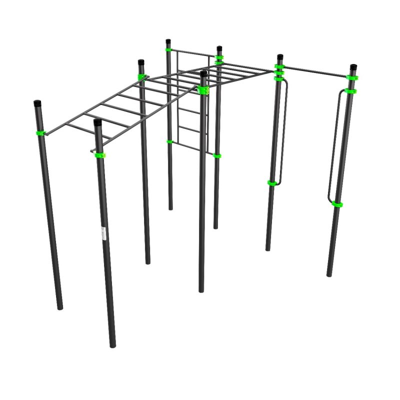 Комплекс для продвинутых тренировок с собственным весом. Разнотипные рукоходы позволяют развивать координацию, силу хвата и мышечную выносливость. Шведская стенка и перекладины дополняют тренировочную зону упражнениями на пресс, растяжку и подтягивания. Вертикальные перекладины открывают возможности для нестандартных элементов.